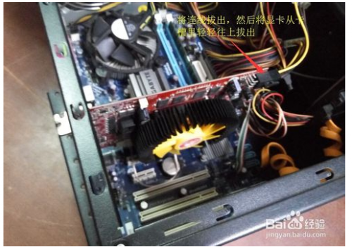 2、將顯卡的插線拔掉,然后將顯卡輕輕往上拔出來(lái)。