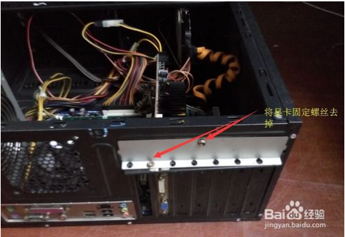 1、要拆卸顯卡風(fēng)扇,必須先將顯卡從電腦上拆下來(lái)。打開(kāi)機(jī)箱,將固定顯卡的螺絲卸掉。