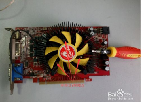 3、將顯卡拔出來(lái)后,用螺絲刀將固定風(fēng)扇的3顆螺絲卸掉。