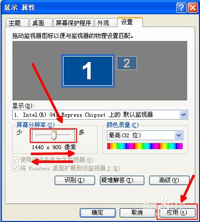 3、在屏幕分辨率哪里的滾動條“向左或向右移動”移動到自己覺得適合為止。在點擊“應(yīng)用”查看效果,調(diào)到適合自己的效果后再點擊“確定”即可還原大小。