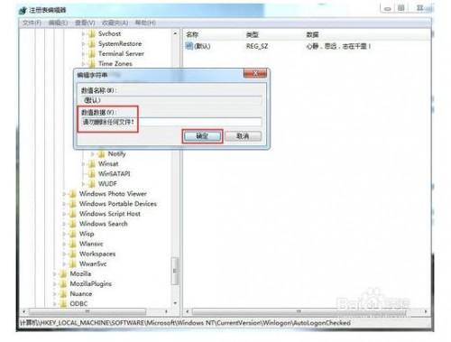 雙擊Autologonchecked鍵值后,在“數(shù)值數(shù)據(jù)”文本框中輸入你要提示或警告的文字,如:請勿刪除任何文件!,然后點擊確定即可;