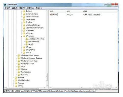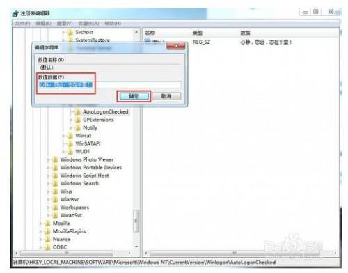 雙擊在它下面的Autologonchecked鍵值名稱,打開“編輯字符串”窗口,在“數(shù)值數(shù)據(jù)|”文本框中輸入信息對話框標題,比如:心靜,思遠,志在千里!,然后點擊確定即可;