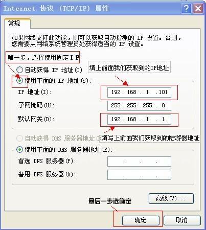 操作如上圖,⒈ 選擇 使用下面IP地址, 在IP地址里 填入開始我們獲取到的 IP地址,再點擊 默認網(wǎng)關(guān) 里面填入我們上面獲取到的陸游器IP地址,如上圖,完成之后進入最后一步,點擊 確定就完成。