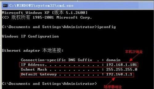 之后在如上圖中的位置輸入獲取本機IP地址命令 ipconfig 輸入完這個命令,按回車鍵運行命令就會得到我們需要的IP地址,如下圖: