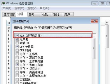 3.之后會彈出一個選擇進(jìn)程頁列的界面,咱們需要在其中找到PID(進(jìn)程標(biāo)識符)選項(xiàng)然后將其勾選上,點(diǎn)擊窗口下方的確定退出設(shè)置窗口。
