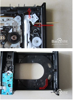 5、在內(nèi)部結構中,我們會看到,托盤的彈出需要用齒輪和皮帶的帶動。大部分光驅不出倉是因為這兩處出現(xiàn)問題。