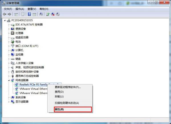 2、打開設(shè)備管理器窗口后,點(diǎn)擊展開“網(wǎng)絡(luò)適配器”,然后右鍵單擊網(wǎng)卡驅(qū)動(dòng),選擇“屬性”,如下圖所示: