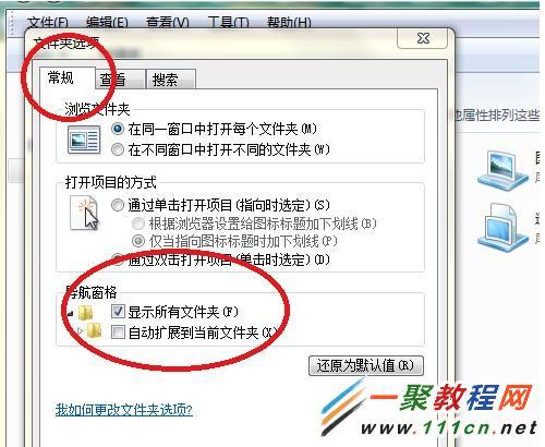 2.然后我們在對話框中點擊“常規(guī)”-“導航窗格”-“顯示所有文件夾”如下圖所示。
