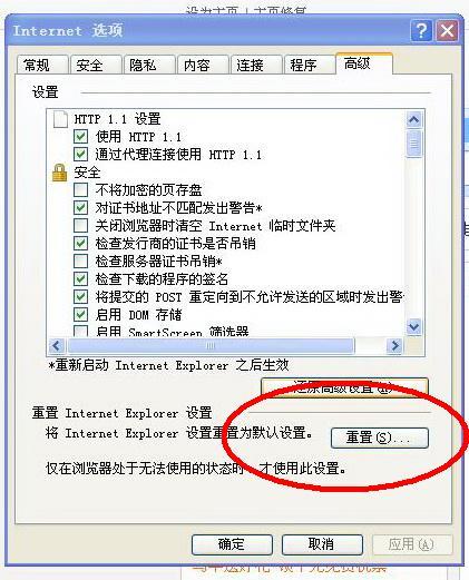 步驟二:在其打開的Internet 選項窗口中,切換到“高級”標(biāo)簽頁中,然后在下面的重置Internet Explorer設(shè)置處點擊“重置”按鈕。