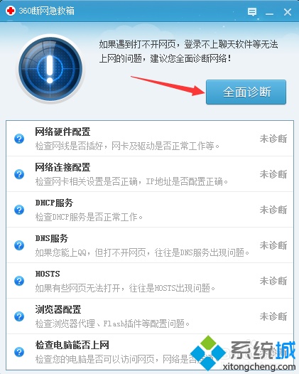 2、打開(kāi)360斷網(wǎng)急救箱之后,點(diǎn)擊“全面診斷”按鈕;