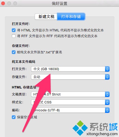 2、在“打開(kāi)和存儲(chǔ)”中選擇打開(kāi)純文本文件的編碼為“中文(GB18030)即可。