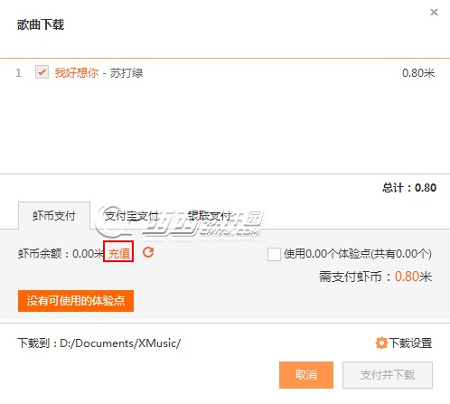 5、蝦米音樂由于音樂版權(quán)問題下載歌曲要收取費用,圖中的0.8米是8毛錢,想要下載的話需要充值。