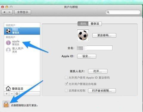 9、在用戶與群組界面就能看到新建的和原來的帳戶,點(diǎn)擊左下角的鎖圖標(biāo)進(jìn)行解鎖。
