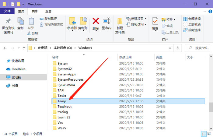 在C盤Windows文件夾下,還有一個沒什么用處的文件夾,那就是系統(tǒng)臨時文件Temp文件夾,也是可以刪除的,右擊選擇刪除即可。