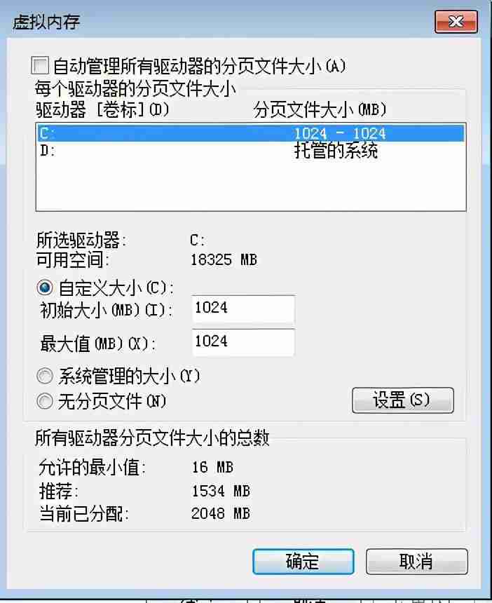 5、首先點(diǎn)擊C盤(pán),然后 選擇自定義大小,本文根據(jù)實(shí)際情況設(shè)置初始大小和最大值都設(shè)置為1024,輸入完畢然后點(diǎn)設(shè)置;然后點(diǎn)擊D盤(pán) ,然后勾選系統(tǒng)管理的大小,然后點(diǎn)設(shè)置,然后點(diǎn)確定,如下圖所示: