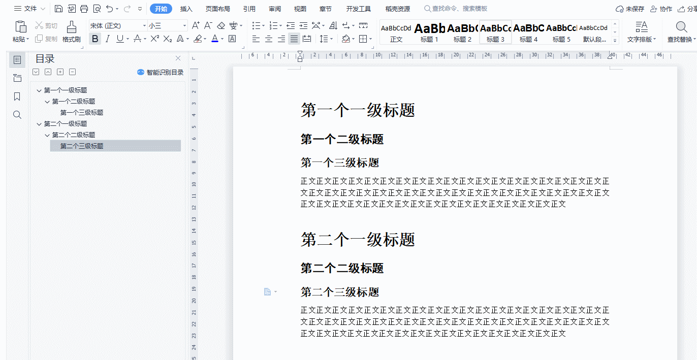 通過左側可以看到設置后標題層級關系(依次從一級到二級再到三級……層層折疊)。
