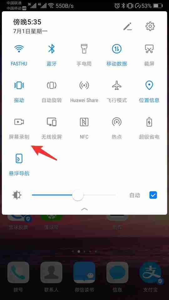 第一個方法非常簡單,大家都知道我們的華為手機的桌面通知欄有非常多的功能,例如截屏、藍牙連接、WiFi網(wǎng)絡(luò)都可以在這里實現(xiàn),同樣的,我們的錄屏功能也可以在這里實現(xiàn),只要輕點一下,然后倒數(shù)3秒就可以進入錄制屏幕的狀態(tài)了。