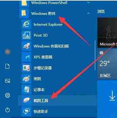 打開截圖工具:在Win10系統(tǒng)桌面,依次點擊“開始”菜單、“Windows附件”,“截圖工具”。