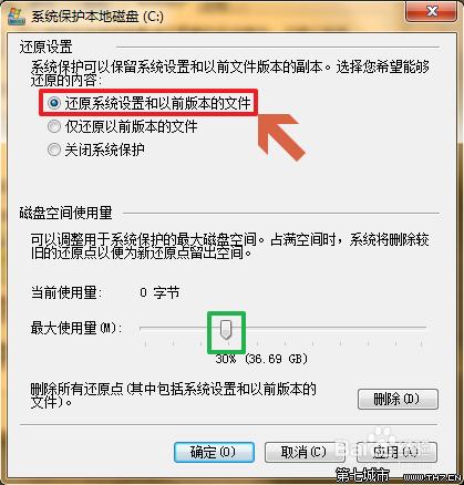 4、在系統(tǒng)保護(hù)本地磁盤界面,選中“還原系統(tǒng)設(shè)置和以前版本的文件”選項(xiàng),并拖動下方滑塊調(diào)節(jié)為還原點(diǎn)所提供的空間大小。