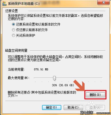 17、如果需要刪除還原點(diǎn),則可以進(jìn)入系統(tǒng)保護(hù)本地磁盤界面,點(diǎn)擊“刪除”按鈕即可。