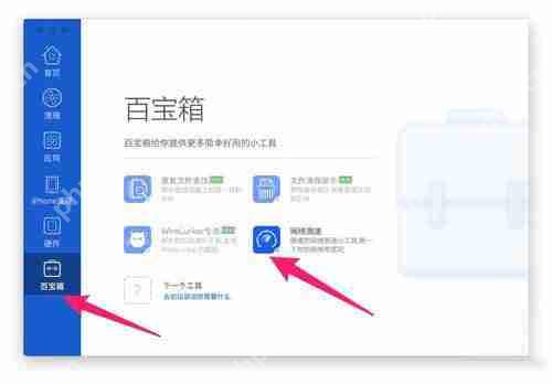 進(jìn)行網(wǎng)速測試時(shí),打開管家,點(diǎn)擊百寶箱,然后選擇網(wǎng)絡(luò)測速。等待小工具下載完成后即可使用。