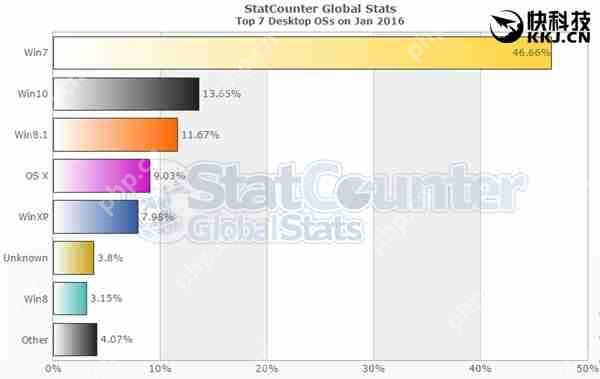 由于統(tǒng)計(jì)方法的不同,StatCount的數(shù)據(jù)略有差異,但整體趨勢(shì)基本一致。Windows 10的市場(chǎng)份額已達(dá)到13.65%,首次超過(guò)Windows 8.1。Windows 10在StatCount的數(shù)據(jù)中以46.66%遙遙領(lǐng)先。