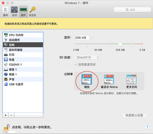 5、Parallels Desktop的設(shè)置方法基本一致,我們在虛擬機設(shè)置的“硬件”——“視頻”設(shè)置頁面,可以看到如圖所示的三種分辨率選項,選擇“縮放”即可。